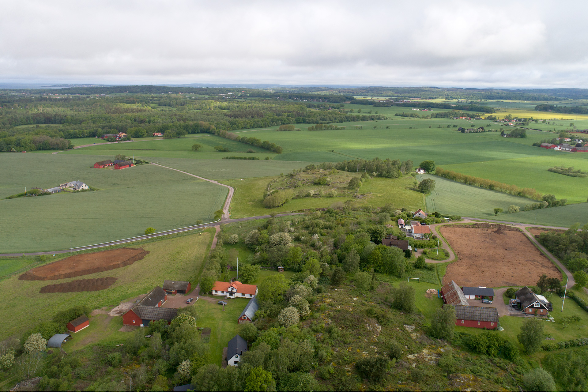 Nu är vi färdiga med vår undersökning i Trottaberg i Söndrum utanför Halmstad, och har påbörjat bearbetningen av våra resultat. Undersökningen berörde två fornlämningar på ömse sidor om en höjdrygg (se drönarbild). På höjdryggen, där dagens bebyggelse är belägen, finns ett tiotal gravar och en rest sten. Gravarna är inte undersökta men tillhör sannolikt bronsåldern eller den äldsta järnåldern. På den östra ytan framkom en boplats med ett stort antal hus. Hittills har sammanlagt 25 hus identifierats inom ytan men sannolikt blir det fler innan efterbearbetningen är färdig. Vi vet att den nu undersökta bebyggelsen är del av ett större boplatsområde som sträcker sig söderut och österut, det. Boplatsområdet har ett långt tidsdjup och spänner över en period från yngsta stenålder in i medeltid. Inom den västra ytan fanns bara ett hus.