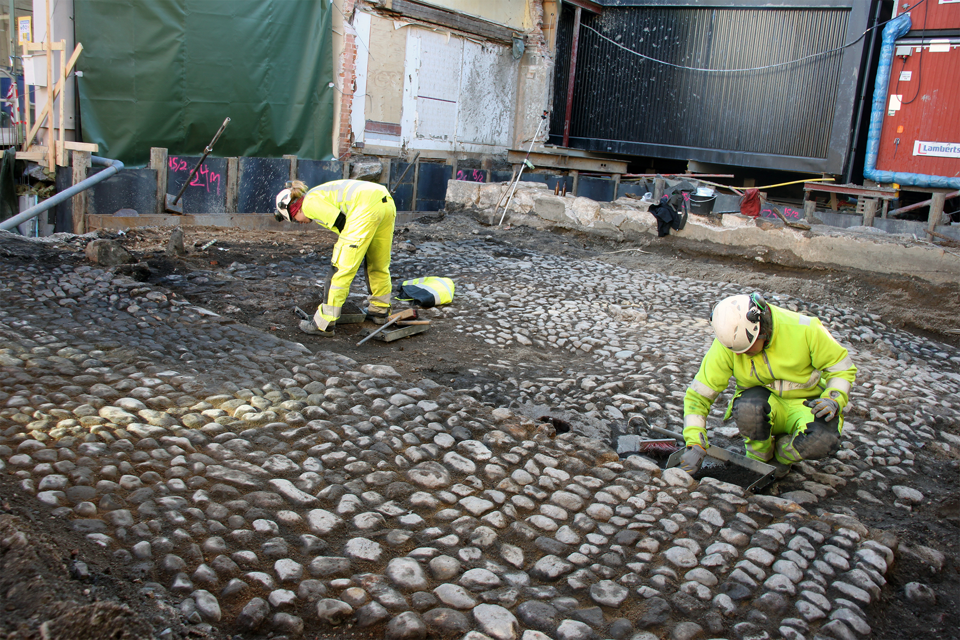 Arkeolog vid stenläggning kvarteret Gripen Norrköping Arkeologi ArkeologikonsultArbetet skedde till stor del med hjälp av grävmaskin med noga övervakning av arkeolog.
