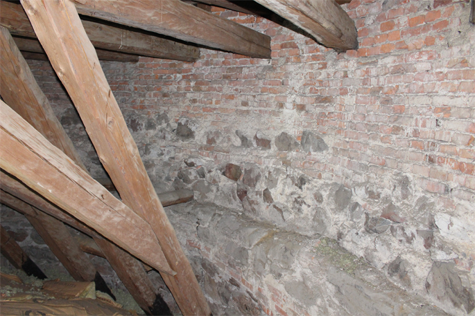 Uppe på vinden på kyrkans äldsta del, rundhuset. Takbjälkarna byttes ut efter en stor brand på 1700-talet.