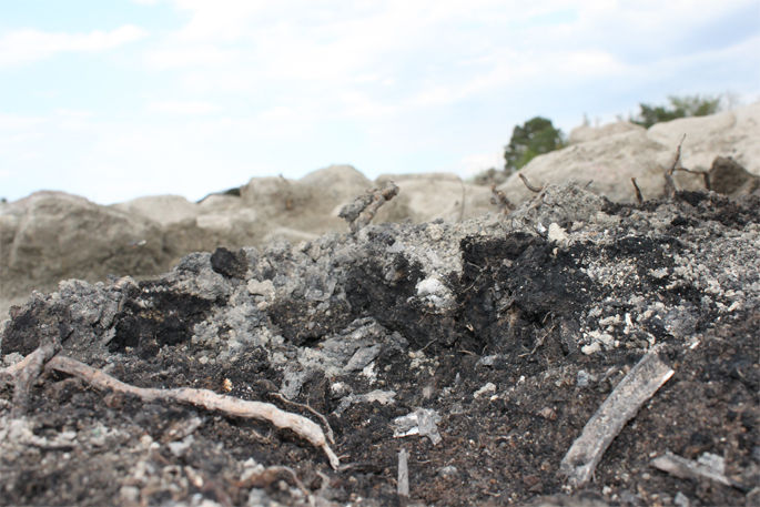 Brandlager i grav 2. I förgrunden syns fragmenterade skelettdelar som blivit förvridna i gravbålets hetta.