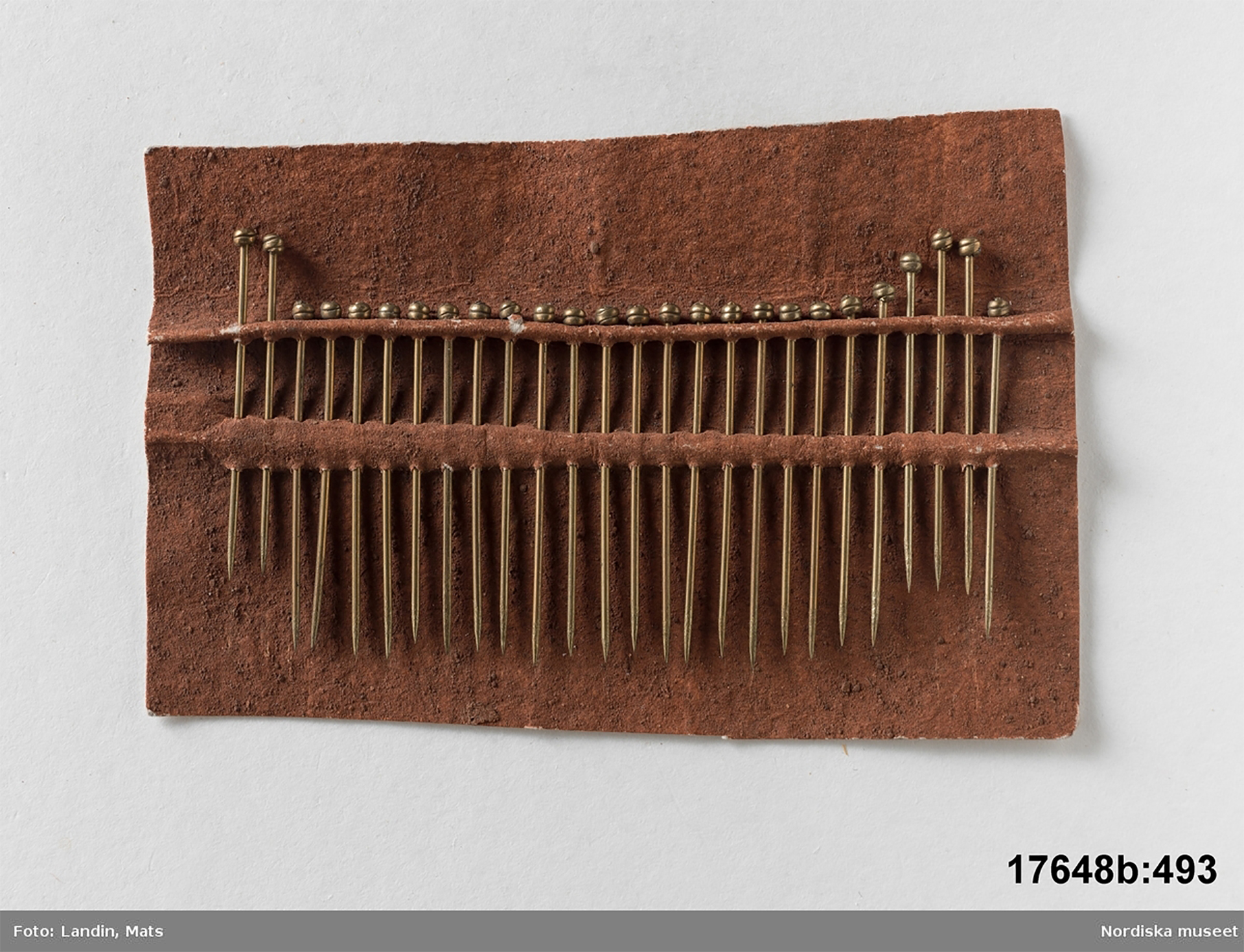 Ett knappnålsbrev med 26 knappnålar i mässing med trådhuvuden. 3,5 cm långa, tillverkade ca 1731. Foto: Mats Landin, Nordiska museet (Id nr NM.0017648B:493). CC BY-NC-ND.