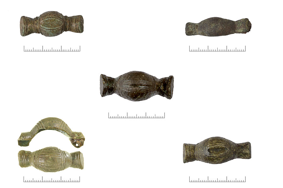 Vi börjar med de små vackra likarmade fibulor från början av Vendeltid som vi hittat. Den här spännetypen dateras till den första delen av vendeltid, 550–600 e.Kr. Spännena karakteriseras av sina tvära ändar och en bred välvd båge, ofta försedd med stämpelornamentik. Dessa bars i par på kvinnodräkten. I Ströja hittade vi fem stycken. Inget spänne var det andra likt och de skiljde sig från varandra i storlek, form eller ornamentik. Samtliga var intakta, så när som på nålen, vilket indikerar att de helt enkelt kan ha lossnat från klädedräkten. Under den här perioden stod fortfarande den stora hallen och antagligen hör fynden till en liknande högstatusmiljö som denna representerar. Den här typen av spännen finns över hela Skandinavien. I tidigare forskning betraktades spännetypen som en viktig ledartefakt som markerade svearnas utbredningsområde. Den tolkningen har sedan länge övergetts. Birgit Arrhenius tolkar det som att spänneformen uppkommit på de nya centralplatser som till kom under folkvandringstid, där Helgö i Mälardalen och Uppåkra i Skåne är de mest kända.